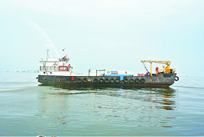 外闯市场靠的是过硬技术和优质服务。TCP油管传输射孔在“石油湖”上首秀便成功擦亮了渤钻测试品牌。BA-2642井位于马拉开波湖中部,井深2530米,射孔井段2026米至2135米。湖上施工难度较大,项目部组织技术人员认真分析井筒状况后,决定选用新型封隔器与4-1/2英寸射孔枪实现负压射孔、保障射孔的深穿透。一切准备就绪,而甲方又临时更改了施工设计。项目部人员没有一丝犹豫,连夜重新拆装仪器,按时优质完成了TCP油管首次施工。