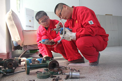 图为技术组对损坏的稳流阀进行维修再利用。