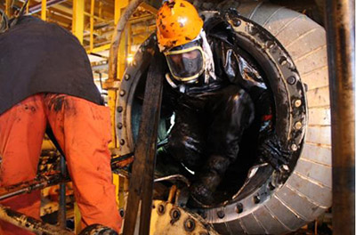 图为平台员工对MEG再沸炉进行清污,由于空间狭小,员工秒变“油人”。