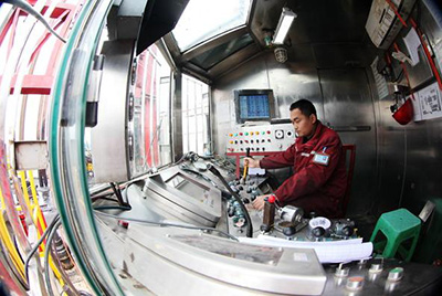 图为华东工程六普钻井50512井队司钻在钻井平台操作室内操作。