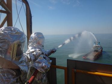 图为平台消防队成员正在联合值守船舶模拟灭火。