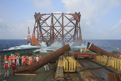 5月3日8时50分,南海西部海域,重量达13124吨的文昌9-2/9-3中心导管架滑落水中就位,它是海油工程今年建造及安装的最大的导管架。