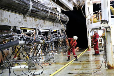 深海先锋号船队在运作完墨西哥项目后开始使用全新升级的软式枪阵连接,并首次在低温且海况恶劣的作业环境中应用。项目开工时也曾出现过不同原因的故障,气爆班组无畏恶劣海况,在确保人员及设备安全的前提下,攻坚克难、逐一排查并进行修复,使得气枪工作状态逐步趋于稳定,创造了船队历史新纪录。