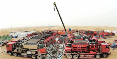 5月29日,西北油田采油四厂SHB5-10井酸压投产,喜获高产油气流。该井位于顺北5条带中段,完钻井深8143米。该井的顺利投产,进一步明确了顺北5条带中段成藏规律,标志着中国石化在特深断溶体油藏开发技术方面取得新进展。图为5月27日,SHB5-10井酸压作业队员安装压裂设备。