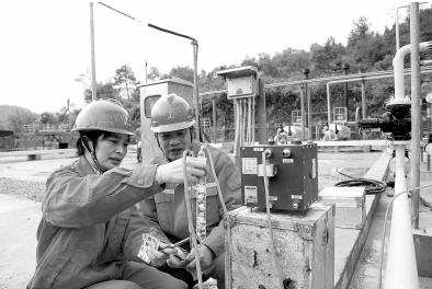 10月20日,涪陵气田首个脱硫试采站——平桥1井脱硫试采站投运,日产气量10万立方米,开启涪陵气田非常规气与常规气共同开采新模式,为气田做好天然气保供和寒武系探明储量申报奠定基础。图为技术员工对气体抽样检查。
