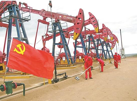 采油三厂党员干部在柳86-33开展主题党日活动。