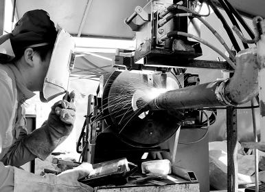 华东石油局在南川页岩气田集气站建设中引进自动焊接机,通过工艺创新及设备改造,实现了直径48毫米到325毫米管线的自动化焊接,焊接效率提高60%。图为5月3日,油服中心员工用自动焊接机焊接管线。