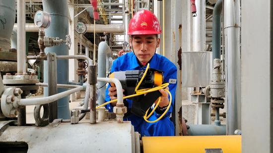 王建用振动分析仪查找动设备振动原因。 聂宏举 摄
