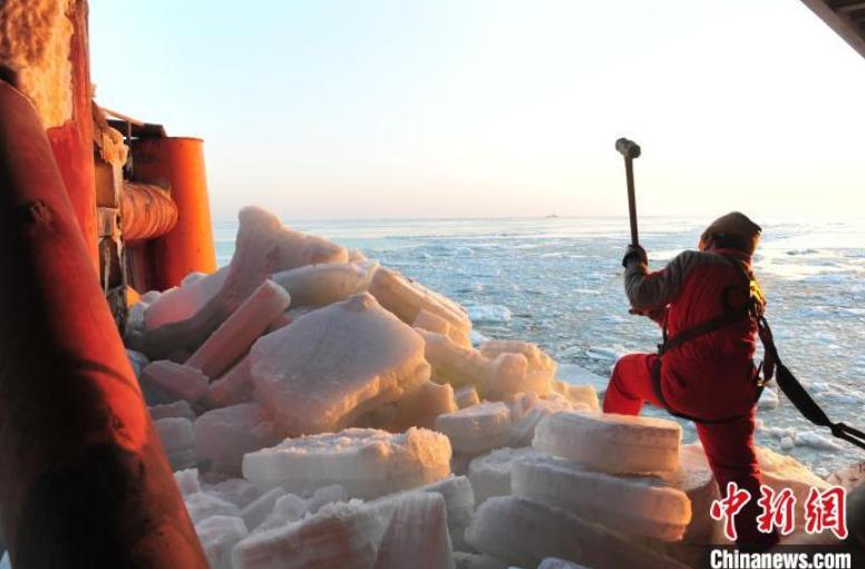 锦州9-3油田的操作人员正在使用冲冰装置破冰。