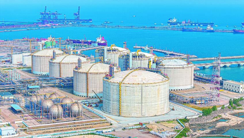 据悉,青岛LNG接收站目前正加快推进储罐投产前的各项准备工作,预计年底前正式投入使用。图为青岛LNG接收站储罐群,最前方储罐为27万立方米储罐。(周佳豪 摄 王卓然 尹悦 文)