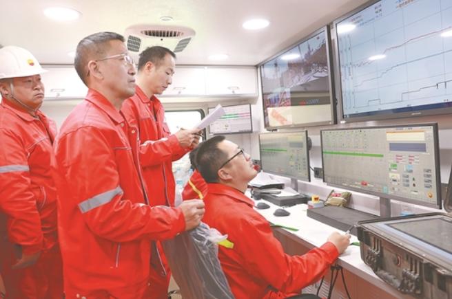 图为技术人员在压裂指挥车内监测压裂施工情况。