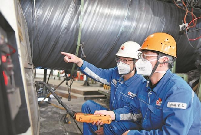 渤海装备公司以“质量月”活动为契机,强化源头管控,多措并举增强全员质量意识、规范员工质量行为、提高产品质量管控水平,为各个重点项目提供优质产品。图为员工对新下线的钢管进行参数核对和全面检测。