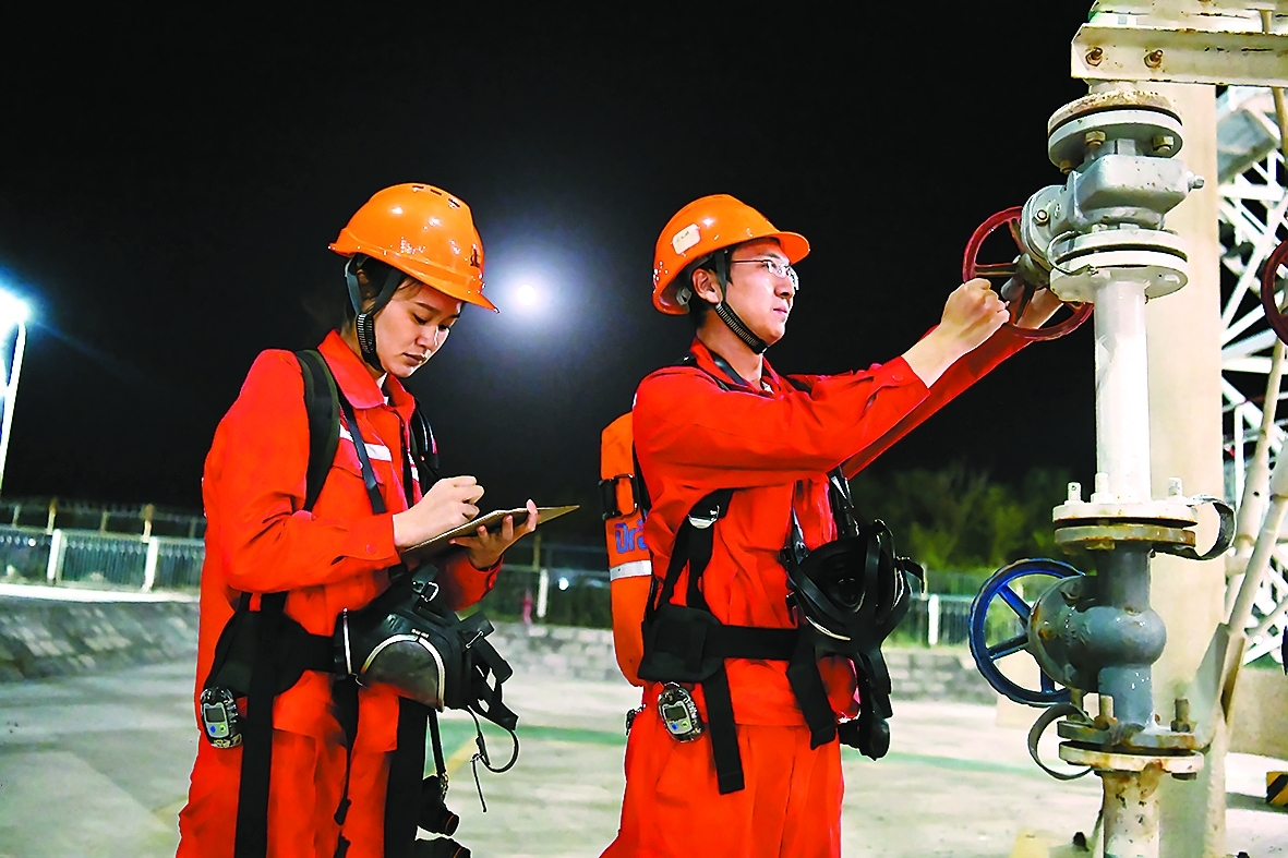 中秋国庆假期,西北油田干部员工坚守岗位,持续加大油气勘探开发力度,加快增储上产步伐,确保各项工作安全平稳有序。图为9月29日三号联合站值班员工在夜间巡检。石立斌摄陈俊峰文