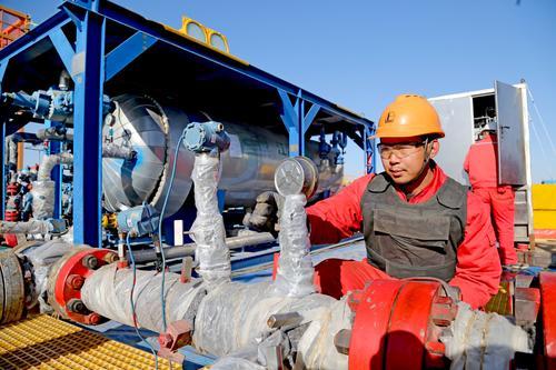 西北油田完井测试管理中心对测井设备进行保温包裹,防止设备冻堵;为现场作业人员配备冬季防寒用品;加强设备巡检,发现隐患问题及时整改,有效保障油气田冬季生产安全平稳运行。图为12月5日作业人员在顺北油气田顺中1斜井作业现场巡检。刘红新摄