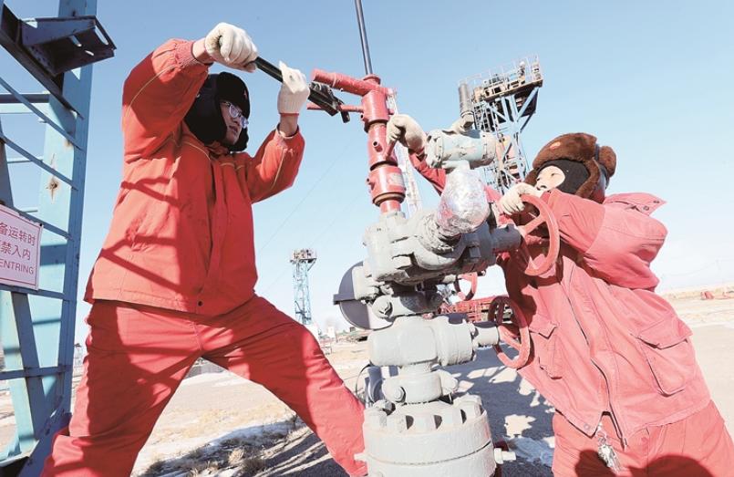图为南堡作业区第一工区岗位员工在南堡1号人工岛南堡11-296井现场,紧固井口盘根盒,杜绝发生原油“跑冒滴漏”。