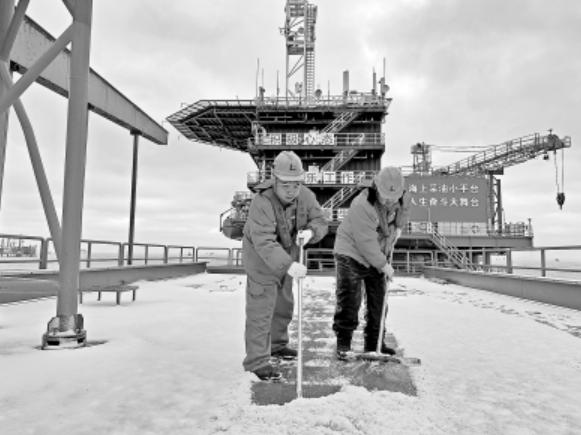连日来,山东地区大风降温降雪,胜利油田海洋采油厂加强生产运行监控,按照现场“三标”(标准化现场、标准化班组、标准化岗位)管理要求,组织干部员工清理平台积雪、维护保养设备、巡检防风防冻关键点,确保海上安全生产。图为1月18日胜利油田中心3号平台员工清理甲板积雪。