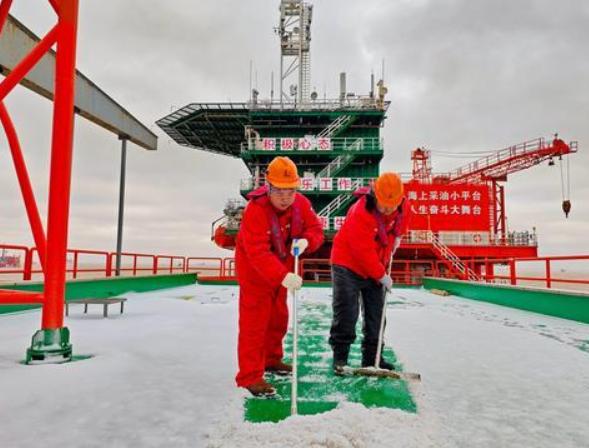 连日来,山东地区大风降温降雪,胜利油田海洋采油厂加强生产运行监控,按照现场“三标”(标准化现场、标准化班组、标准化岗位)管理要求,组织干部员工清理平台积雪、维护保养设备、巡检防风防冻关键点,确保海上安全生产。图为1月18日胜利油田中心3号平台员工清理甲板积雪。