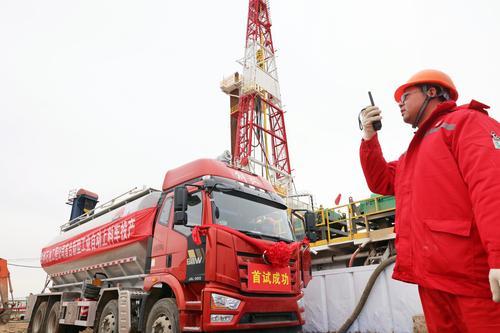 近日,胜利石油工程公司首台工业盐自动上料车在50427钻井队现场正式投产,实现了去包装、减人工、自动化的工业盐绿色供应。图为工业盐自动上料车正在对井场循环罐加注工业盐。张玉摄