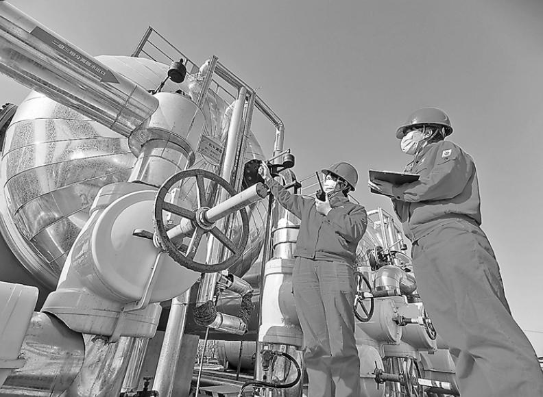 王四联合站支部党员倪萍(右一)和化验岗员工正在认真检查站内三相分离器运行参数。