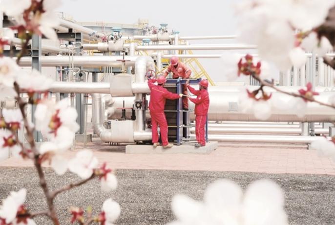 4月11日,在冀东油田油气集输公司高尚堡联合站,员工们自己种植的桃花开了。大家在桃花映衬下维护保养原油换热器设备,确保春季安全生产。