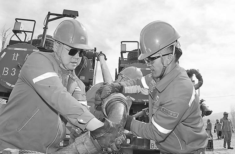 高压班员工肖正军(左)和郑周臣安装压裂管汇。