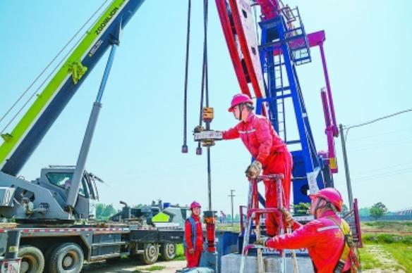 针对连日来的高温天气,中原油田地面工程抢维修中心推行错时施工制度,避开高温时段,利用较为凉爽的时段进行施工,降低户外作业风险,保障施工有序推进。图为6月12日该中心员工进行WC2-73井抽油机安装作业。