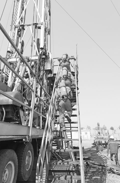 图为员工奔赴钻台,进行紧急处置演练。
