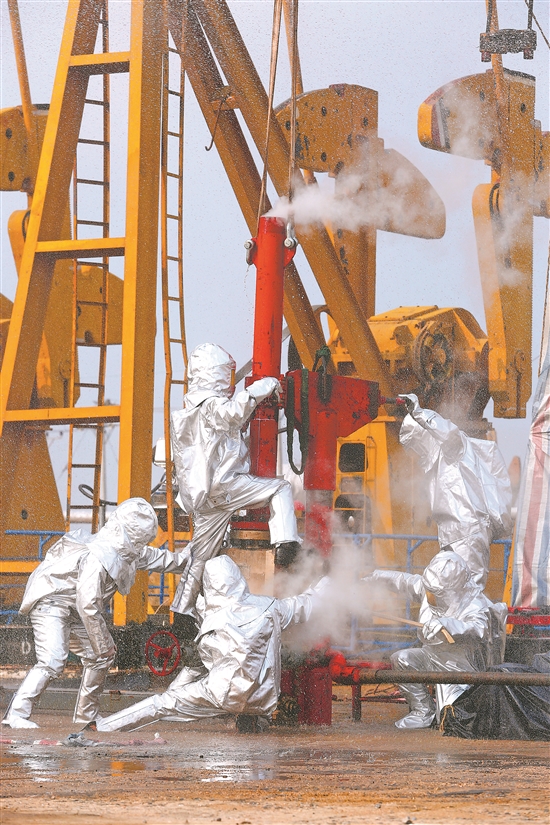 辽河油田工程技术公司将井控演练常态化,做到开井练、关井练、随机练、反复练,形成动作惯性,保证良好的安全生产状态。图为井控演练现场。张旭 陈允长 摄影报道