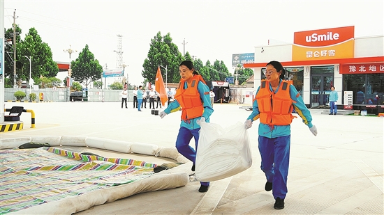 近日,河南销售2024年加油站防汛应急预案演练在鹤壁淇县二站举行。演练进一步提升了加油站应急处置能力。图为应急演练现场。于露 边蕾 摄影报道