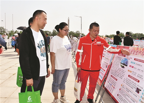 近日,渤海钻探公司积极参加“安全宣传咨询日”活动,向市民群众解答安全生产、应急救援等方面问题,大力宣传安全生产方针政策、法律法规,普及安全知识。图为公司员工为市民讲解安全知识。屈春炜 摄