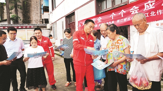 6月21日,西南油气田重庆相国寺储气库、重庆气矿等单位联合组成长输管道安全宣传志愿服务小队,向铜相线沿线村民宣讲天然气长输管道保护的相关知识,解答村民提出的相关疑难问题。图为志愿服务小队人员向村民发放宣传册。李传富 谭沁心 摄影报道