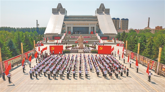 赓续精神血脉,让大庆红旗绽放夺目光彩。图为铁人王进喜纪念馆举行“七一”主题宣誓活动。韩京 摄