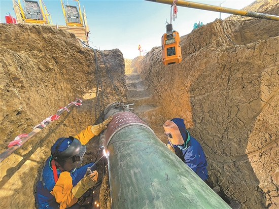 图为焊工靳月阳、于百松在管道两侧进行焊接作业。