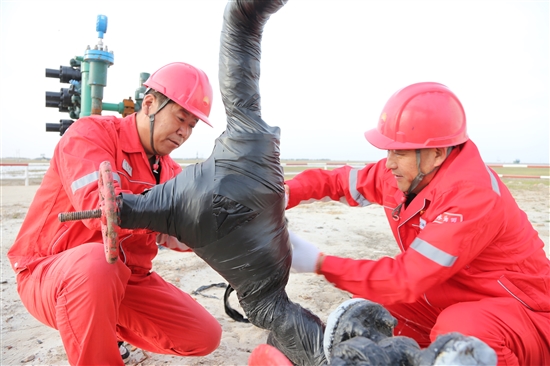 吉林油田吉林西部新能源公司员工正在为井口做保温。 王珊珊 摄