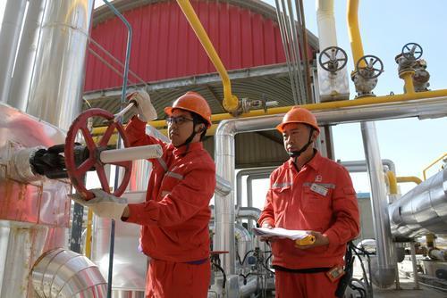 图3:西北油田采油一厂加大对天然气处理装置的巡检力度,及时优化调整关键设备的运行参数,做好低温管线保温工作,目前日外输天然气100万立方米。图为10月12日员工在30万立方米轻烃回收装置区巡检。孔守曾摄