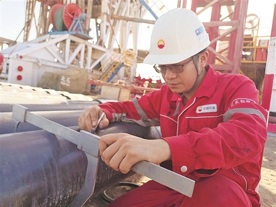 川庆70584钻井队工程师正在进行套管外径测量工作。