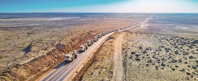 图为东方物探在实施2025年长庆探区首个三维项目——上海庙北项目时,20多台EV56高精度可控震源向工区进发。