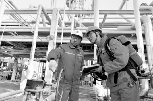 图为集团公司特级技师、劳动模范刘勇(左)在生产现场为岗位员工讲解装置流程。