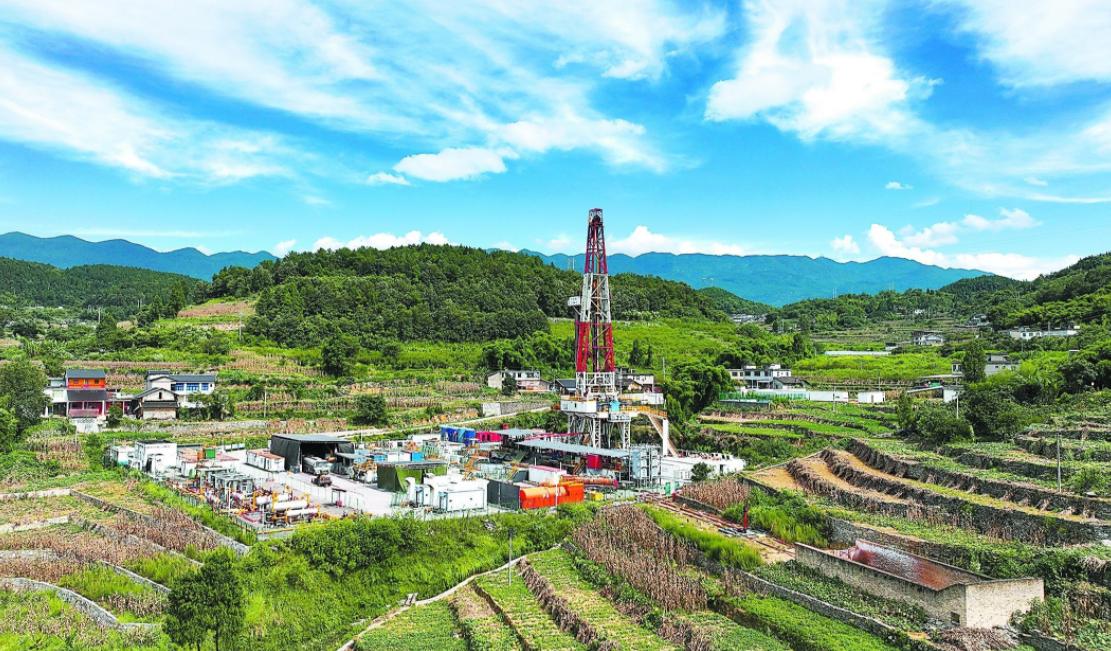 今年以来,江汉油田涪陵页岩气田锚定“万千百”战略目标,成立新井运行专项工作组,持续优化新井试气流程、地面集输工艺,完善标准化设计,保障新井按时间节点投产,累计完成钻前平台16个,开钻49口井、完井68口、投产井66口,为实现全年产建目标奠定基础。图为8月25日钻进中的焦页40号平台。