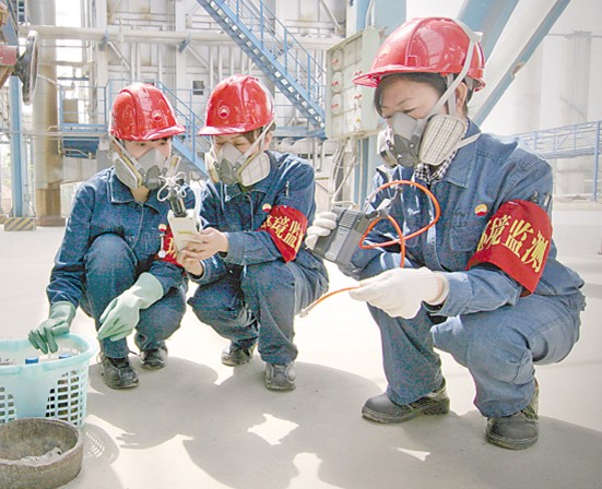 图为检修人员检测乙烯装置电气设施,为装置生产新产品创造条件。