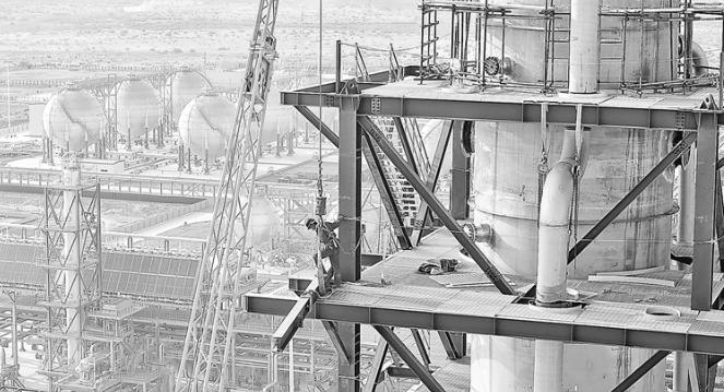 目前,项目综合进度已超过60%,进入后半程冲刺阶段。当前项目主要工作内容为塔器安装、空冷器安装、站外管道连头及配套的土建、防腐等工序。在施工现场,焊花与沙砾共舞,塔器吊装的指令声、机械运转的轰鸣声交织成戈壁盛夏波澜壮阔的交响曲。
