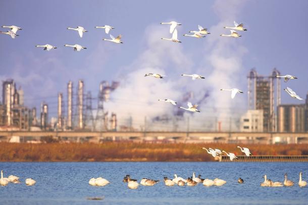 图为在“静悄悄”的施工环境下,水鸟在施工区域附近的水域或栖息或翱翔。