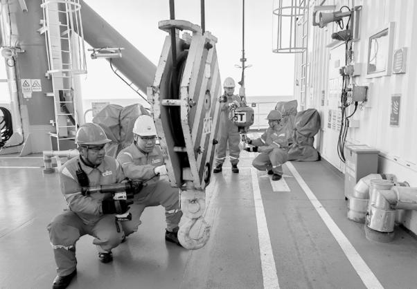 图为埕海1-1平台党员在进行吊车检验、维保作业。
