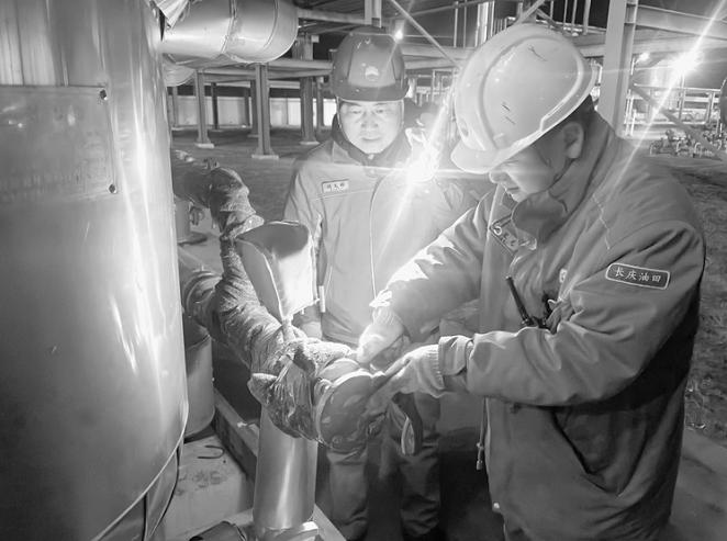 “快拿防爆工具。”谈文辉压低嗓音,话语急促。冯康迅速从随身工具包中取出防爆扳手和梅花螺丝刀;谈文辉则利落地拆开法兰外保温层,手指精准触到漏点。寒风中的金属冰冷刺骨,两人动作却毫无迟滞。凭借多年搭档形成的默契,一人稳扶法兰,另一人用工具逐步紧固螺栓。动作沉稳娴熟,几分钟后,嘶嘶声彻底消失。他们又手持检测仪反复核查3遍,确认泄漏完全消除,才松了口气。