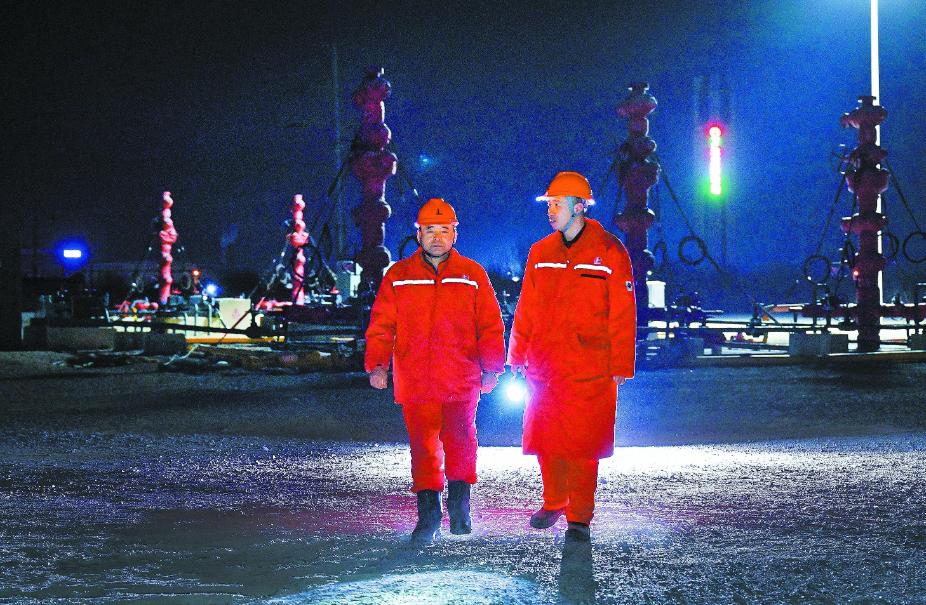 2月16日夜间,兰涛(右)带领员工在丰页中区5号台油井现场巡检。