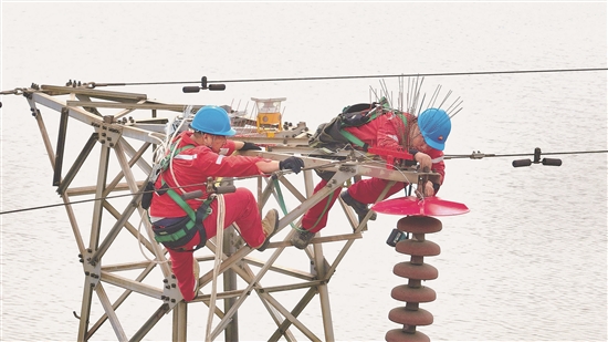 图为4月16日,冀东油田新能源事业部(供电公司)员工韩彬(左)和罗春天,在南海124线路44号塔上进行绝缘护罩及鸟刺安装作业。(杨军 摄)