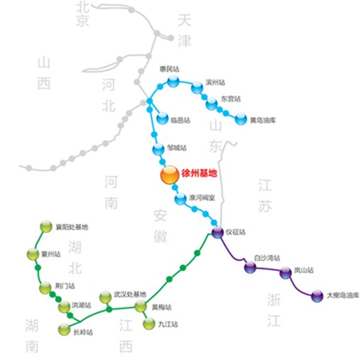 图为中国石化原油管道示意图。记者先兵分两路,北路(蓝线)从黄岛油库出发,经东营站、惠民站、邹城站、徐州基地等到达仪征站;南路(紫线)从大榭岛油库出发,经岚山站、白沙湾站到达仪征站。两路记者会合后组成西路(绿线),从仪征站出发,经黄梅站、九江站、武汉处基地、洪湖站、荆门站等最后到达襄阳处基地。王强制图
