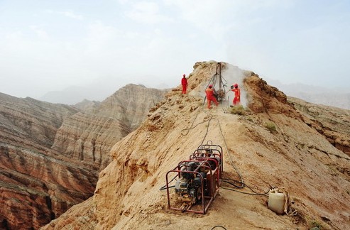由川庆钻探物探山地分公司承担地震采集的塔里木库车凹陷迪北1三维项目,正在向高大山体区发起冲刺。这里山势险峻,沟壑纵横,最高海拔3238米。作业员工穿梭在断壁、山崖之间,用钢钎和保险绳搭起了运输通道。