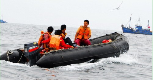 图为施工人员乘坐橡皮艇赶往生产地点。郑玉川摄