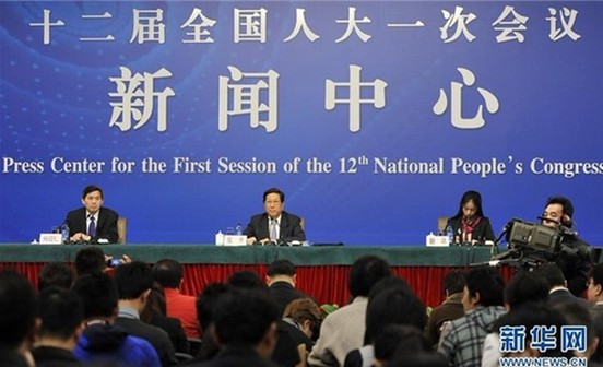 3月6日,十二届全国人大一次会议在北京两会新闻中心举行新闻发布会,邀请国家发改委主任张平介绍经济社会发展与宏观调控有关情况并回答中外记者提问。新华社记者王鹏摄